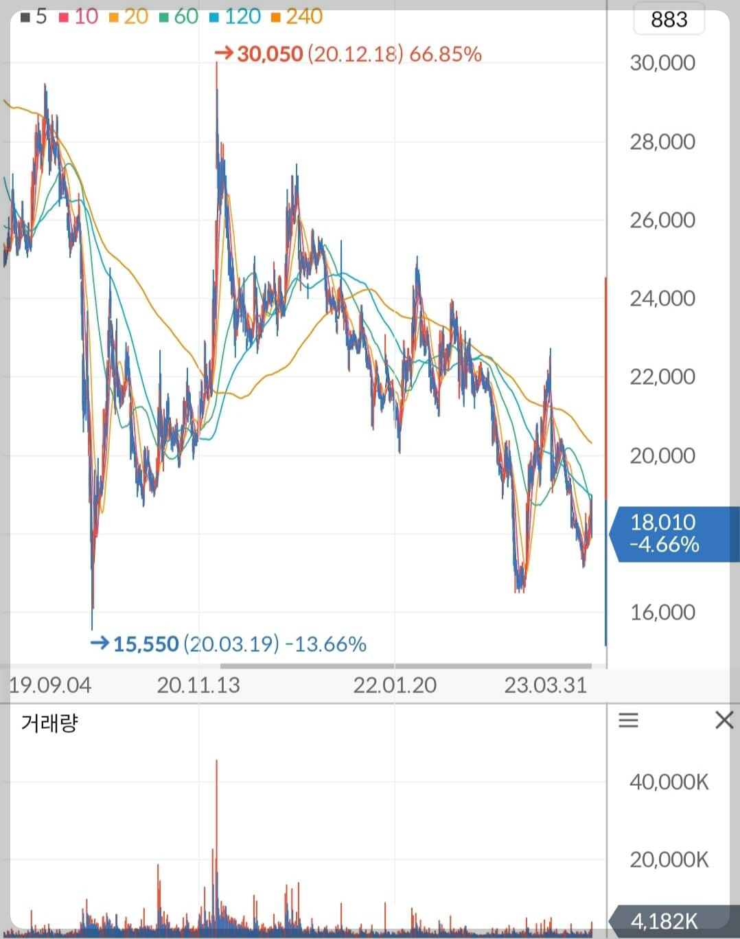 - '20년 3월 코로나 팬데믹 선언 ▼ 주가 15,550원까지 하락