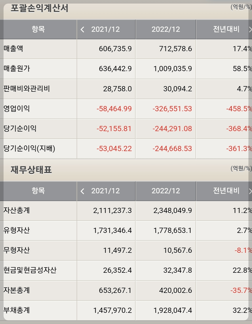 한국전력은 22년 4분기 영업손실만 11조를 기록했습니다. 적자를 조금이나마 메꾸기 위해 보유 자산을 매각하고 발전 자회사들의 모든 이익을 회수하고 있음에도 구조적인 적자를 벗어나기는 불가능하며, 결과적으로 2021년 60조에 달했던 자본은 2023년 10~20조로 감소할 것으로 전망하고 있습니다.