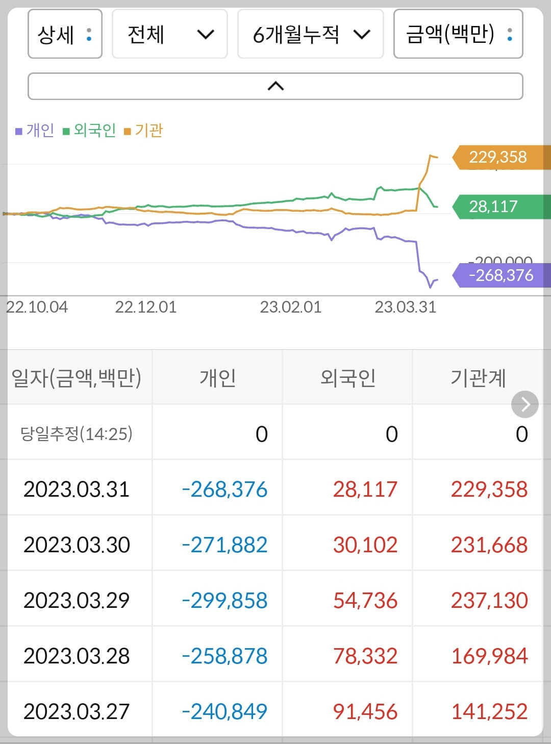 - 개인 2,683억 매도, 외국인 281억 매수, 기관 2,293억 매수