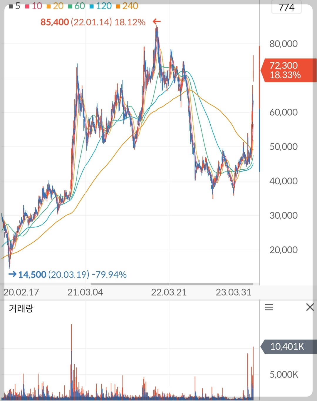 - '20년 3월 코로나 팬데믹 선언 ▼ 주가 14,500원까지 하락