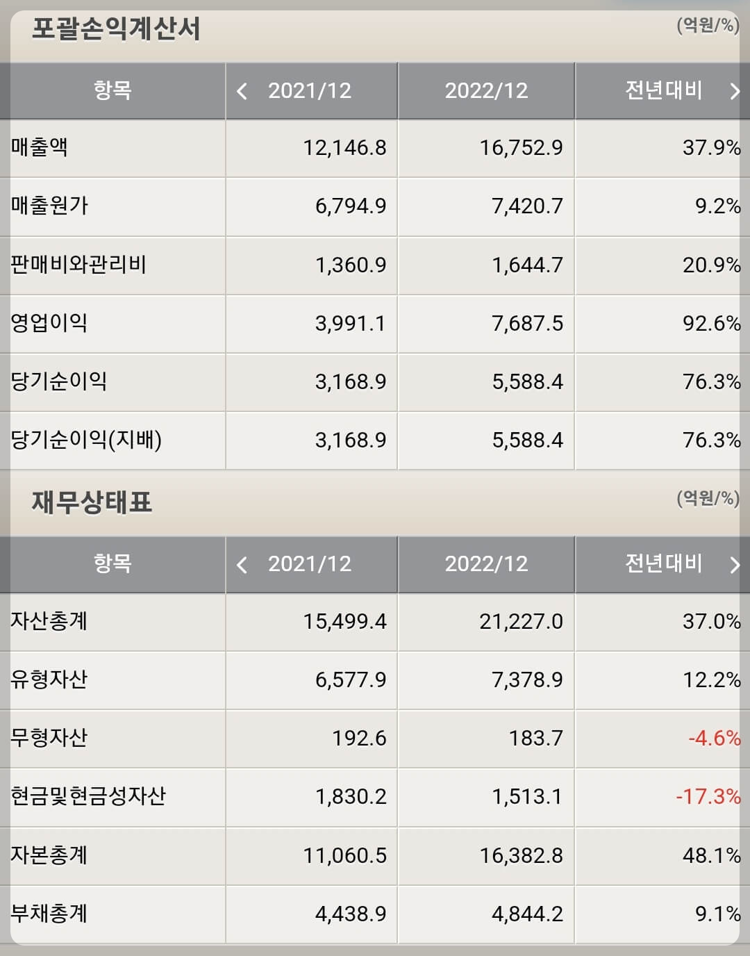 따라서 DB하이텍은 압도적인 시장 지위를 점유할 수 있었는데, 이는 2022년 영업이익률 약 46%라는 수치가 이를 증명해주고 있습니다. 어떤 제조업에서 영업이익률 46%를 기록할 수 있을까요? 대표적인 고 PER 기업인 바이오, 게임 섹터에서도 영업이익률 46%는 찾아보기 어려울 겁니다.
