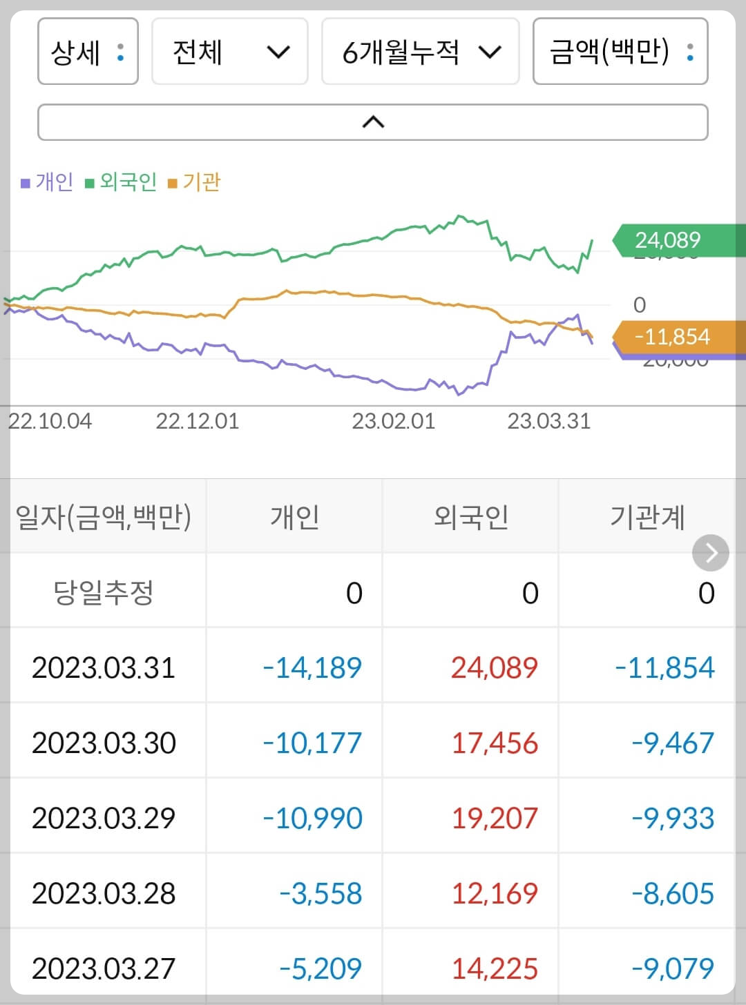 - 개인 141억 매도, 외국인 240억 매수, 기관 118억 매도