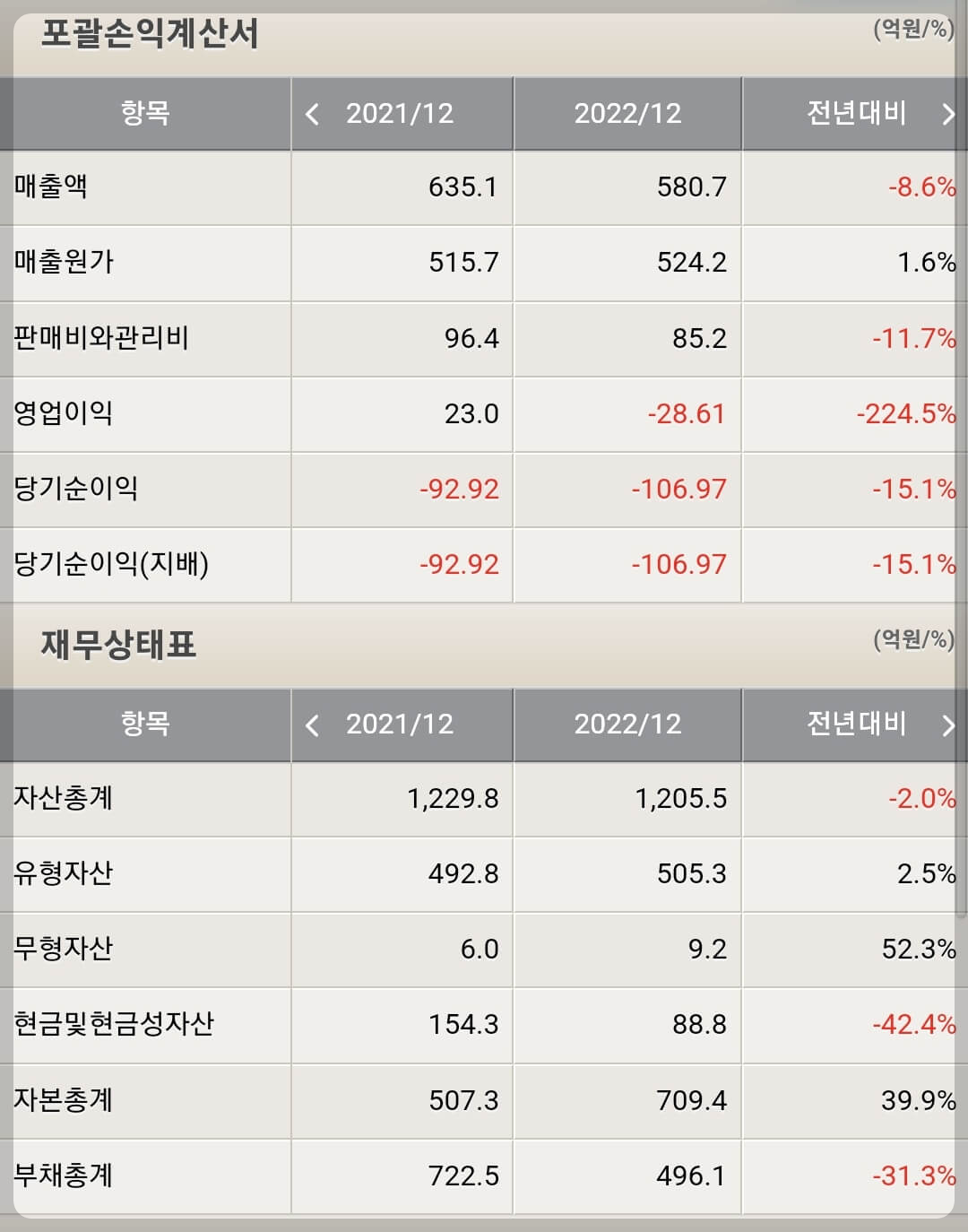 이브이첨단소재 재무제표를 보시면 2022년 매출은 감소했음에도 원가가 증가하며 적자전환했습니다. 코로나 종식에 따라 IT기기에 대한 수요가 급격히 둔화된 것이 주요 원인이며 이에 따라 주요 거래처인 LG 계열사와의 거래 규모가 감소하고 있는 상황입니다.
