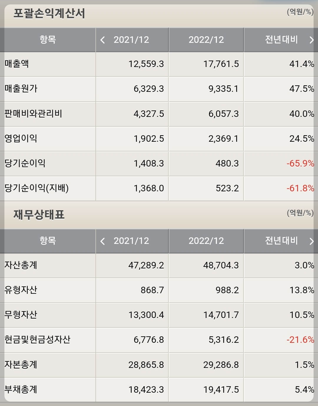 최근 하이브의 4분기 실적을 보면 영업이익 517억을 기록하며 이전 영업이익률 13~17%% 대에서 영업이익률 9%대로 추락했습니다. BTS의 고가 앨범과 세븐틴, TXT 콘서트 매출 등이 반영되며 양호한 매출 5,300억을 기록할 수 있었지만 아티스트들의 앨범 제작비가 예상보다 훨씬 상회하면서 수익성을 훼손한 것이 주요 원인으로 추정됩니다. 위 하이브의 재무제표를 보시면 매출 상승률을 상회하는 매출원가 상승률을 확인하실 수 있습니다.