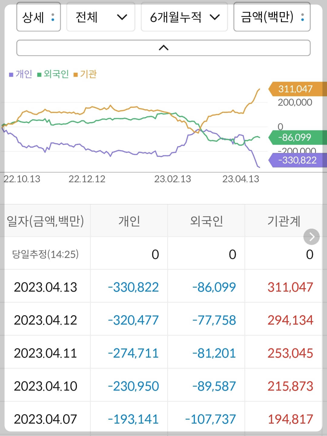 - 개인 3,308억 매도, 외국인 860억 매도, 기관 3,110억 매수