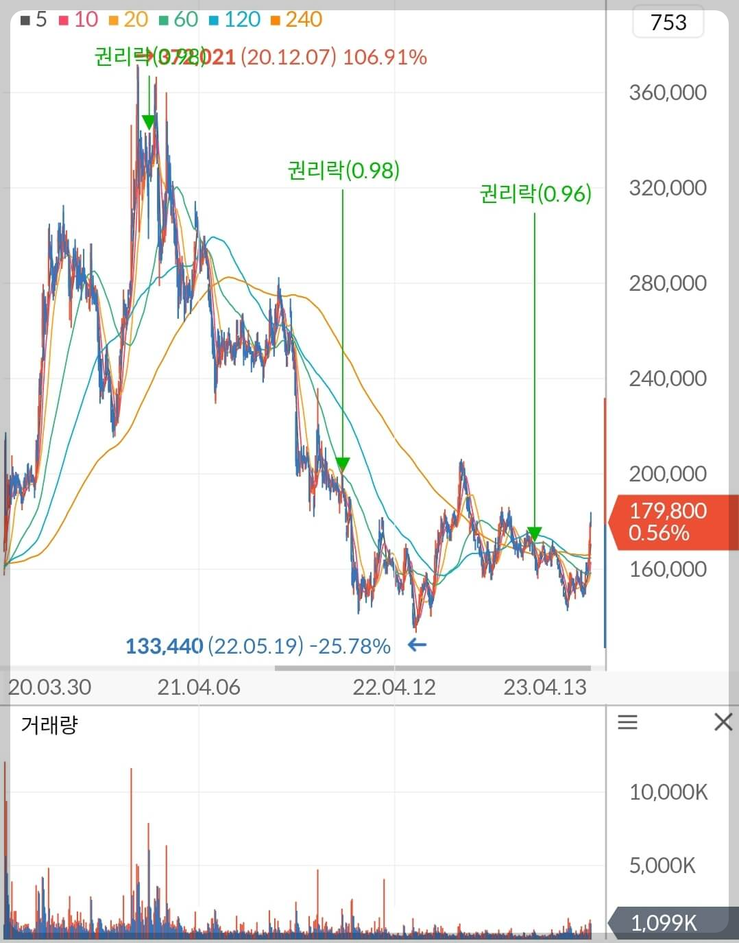 이전 셀트리온 분석에서 240일 장기 이평선이 눕기 시작했고 주가는 버텨주고 있기 때문에 이후에는 반등이 나올 확률이 굉장히 높다고 말씀드렸습니다. 예상에서 크게 벗어나지 않고 셀트리온의 주가는 점점 활력을 찾아가고 있으며 시황 개선과 더불어 2023년 주가 상승 모멘텀을 보유하고 있기 때문에 중장기로 대응하셔도 좋을 것으로 판단됩니다.