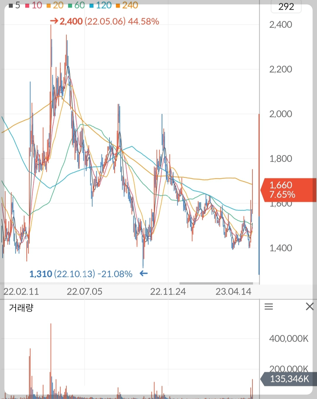 2) 1억 주 이상 터지며 추세전환 시도 중