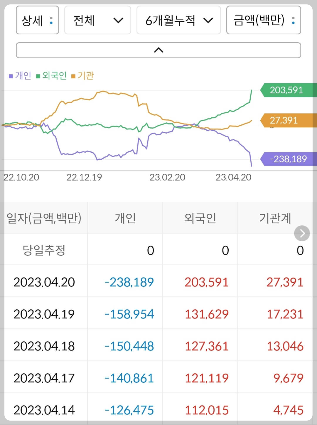 - 개인 2,381억 매도, 외국인 2,035억 매수, 기관 273억 매수