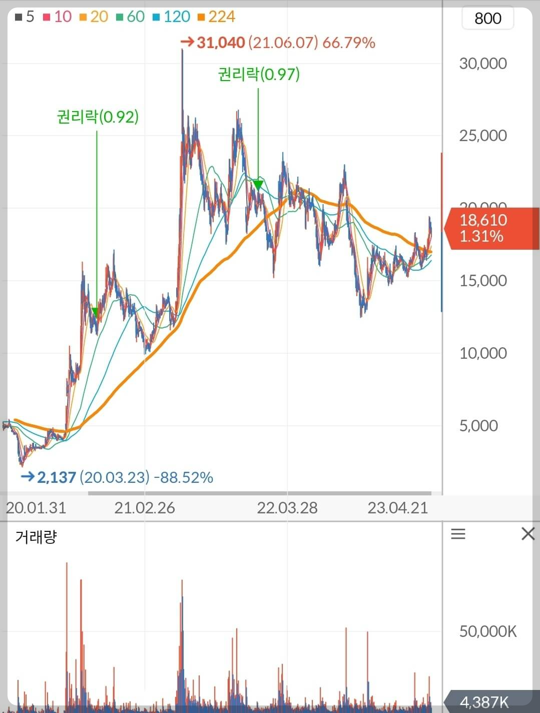 두산에너빌리티의 주가는 가파른 하락세를 멈춰 세우고 추세전환의 정석인 저점과 고점을 높여가며 이평선들을 우상향으로 돌려세웠습니다. 일봉 기준 장기이평선 224일선은 아직 하락추세에 있지만 지금 자리에서 버텨주기만 해도 2~3개월 이내에 우상향으로 전환될 것 같습니다.
