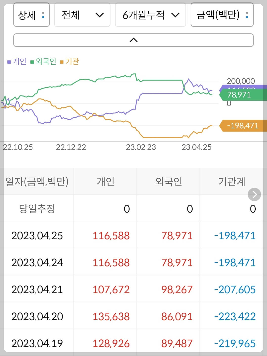 작년부터 공격적으로 양매수 포지션을 구축하던 기관 및 외국인 투자자들은 최근 6개월 동안은 특별한 움직임 없이 관망하는 것으로 보입니다.