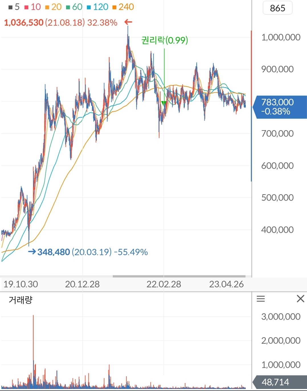 - '20년 3월 코로나 팬데믹 선언 ▼ 주가 348,400원까지 하락