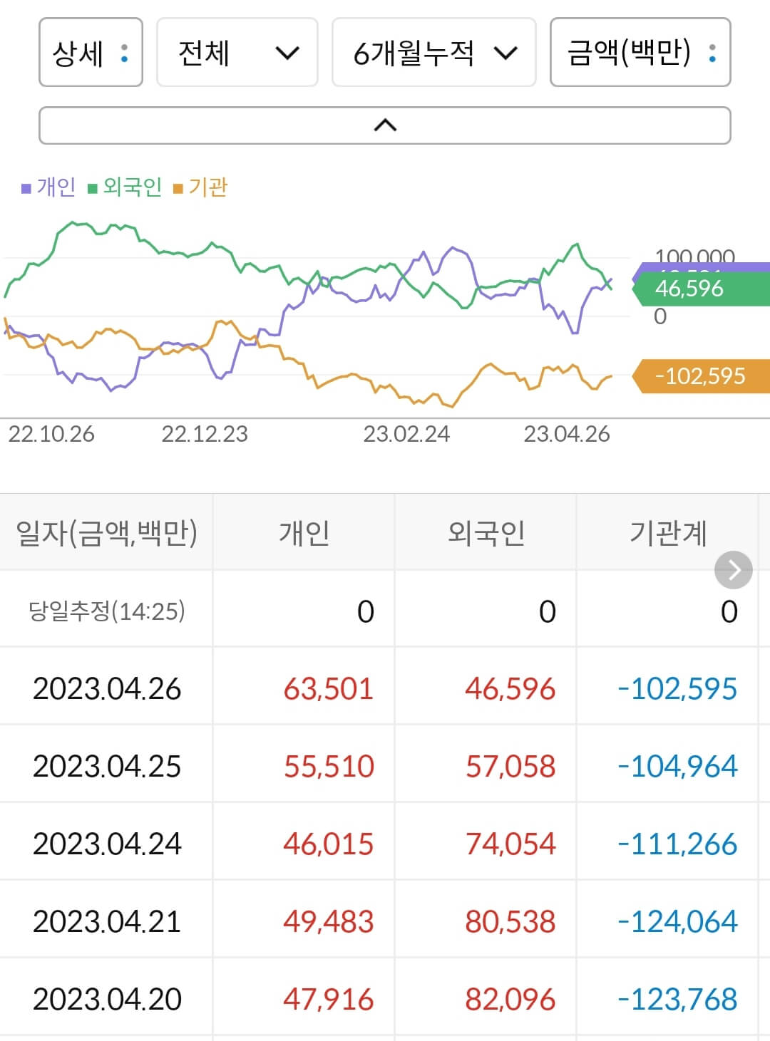 - 개인 635억 매수, 외국인 465억 매수, 기관 1,025억 매도
