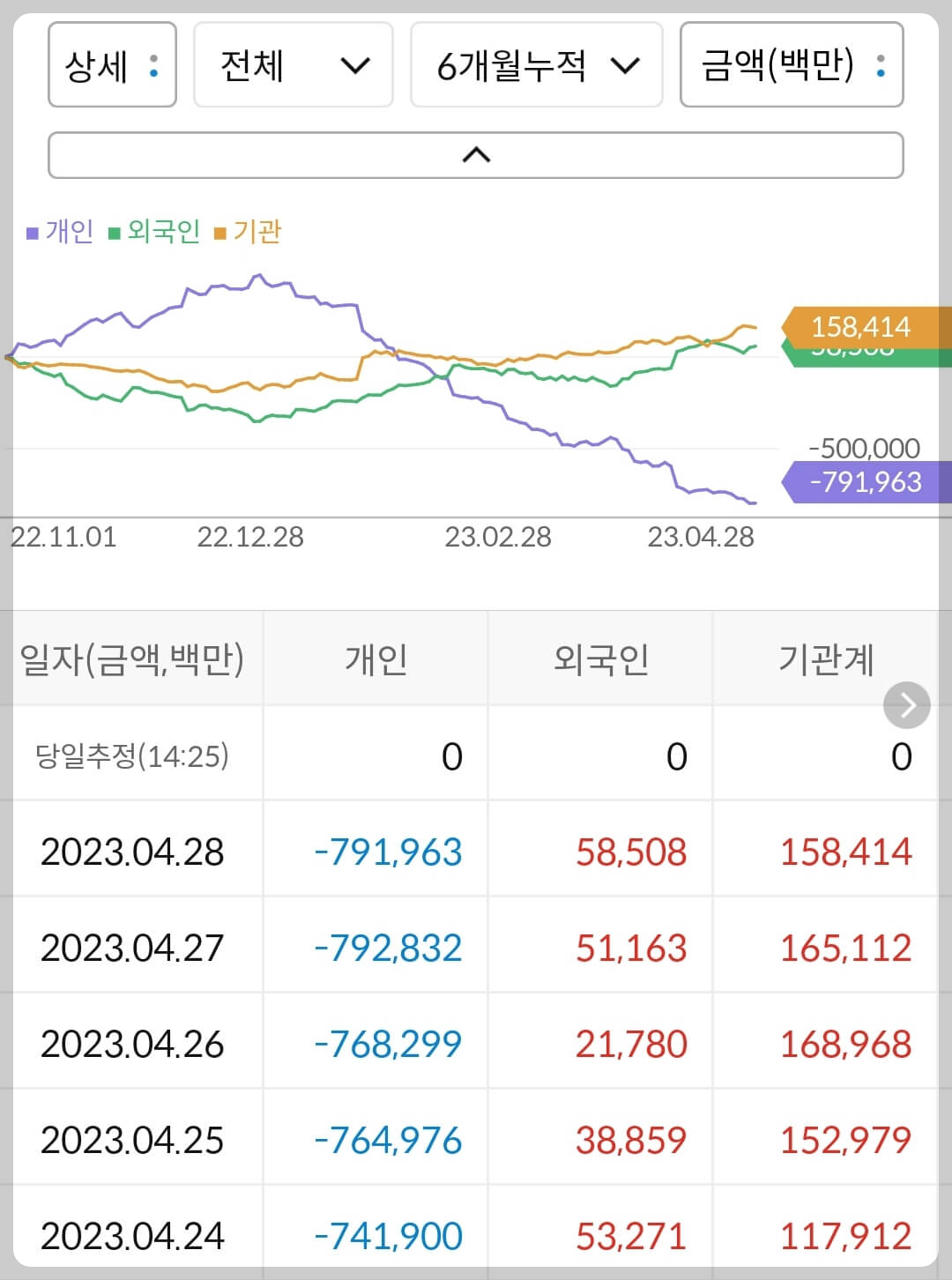- 개인 7,919억 매도, 외국인 585억 매수, 기관 1,584억 매수