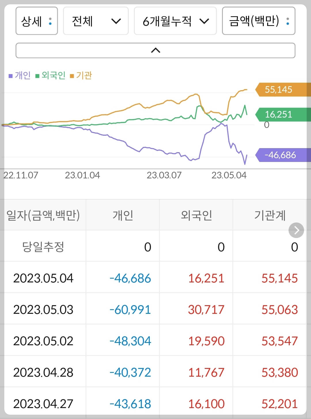 - 개인 466억 매도, 외국인 162억 매수, 기관 551억 매수