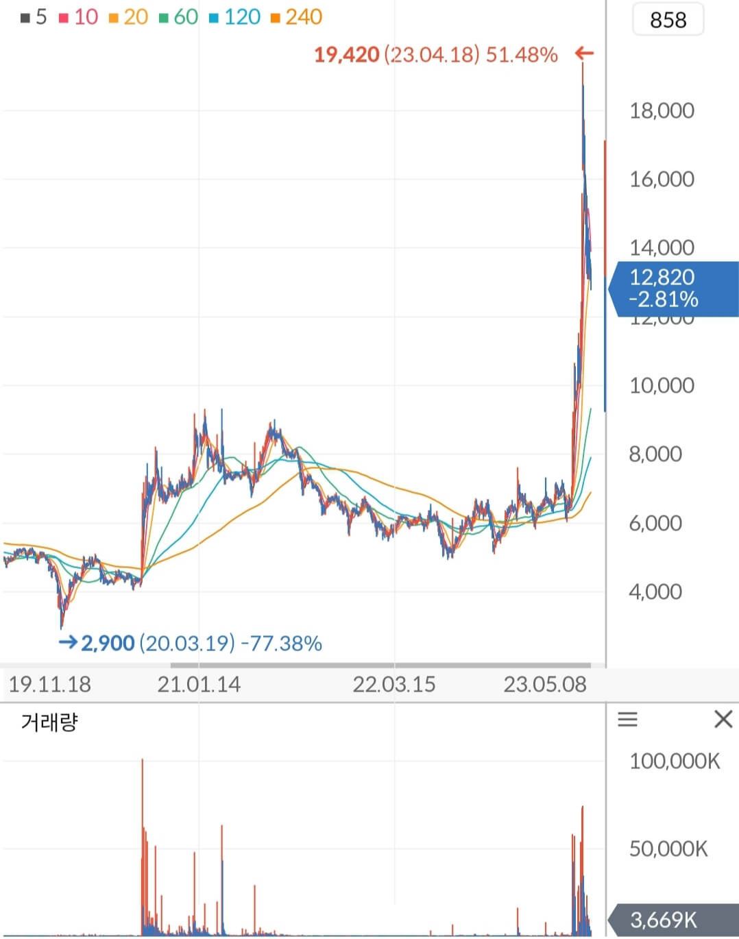 - 시장 관심도가 매우 높은 테마에 편입되며 거래량 폭발 중