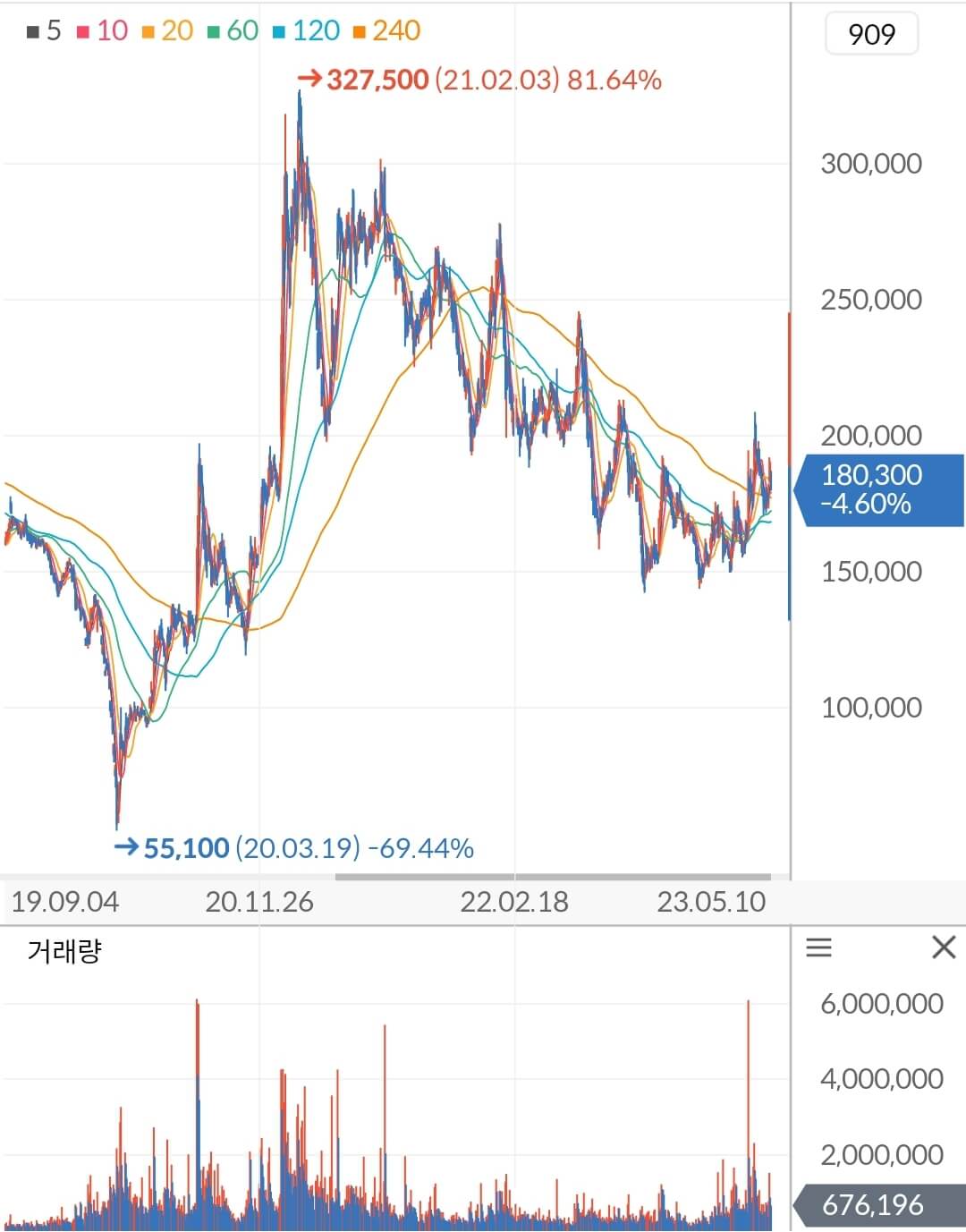 - 배터리 사업 대규모 적자 ▼ 주가 150,000원대 하락