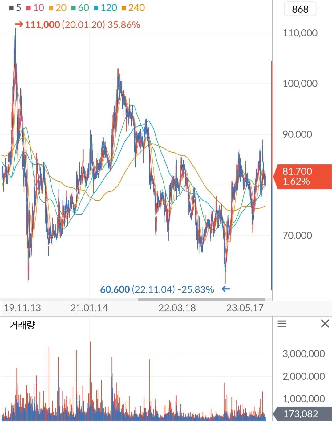 - '20년 3월 코로나 팬데믹 선언 ▼ 주가 60,700원까지 하락