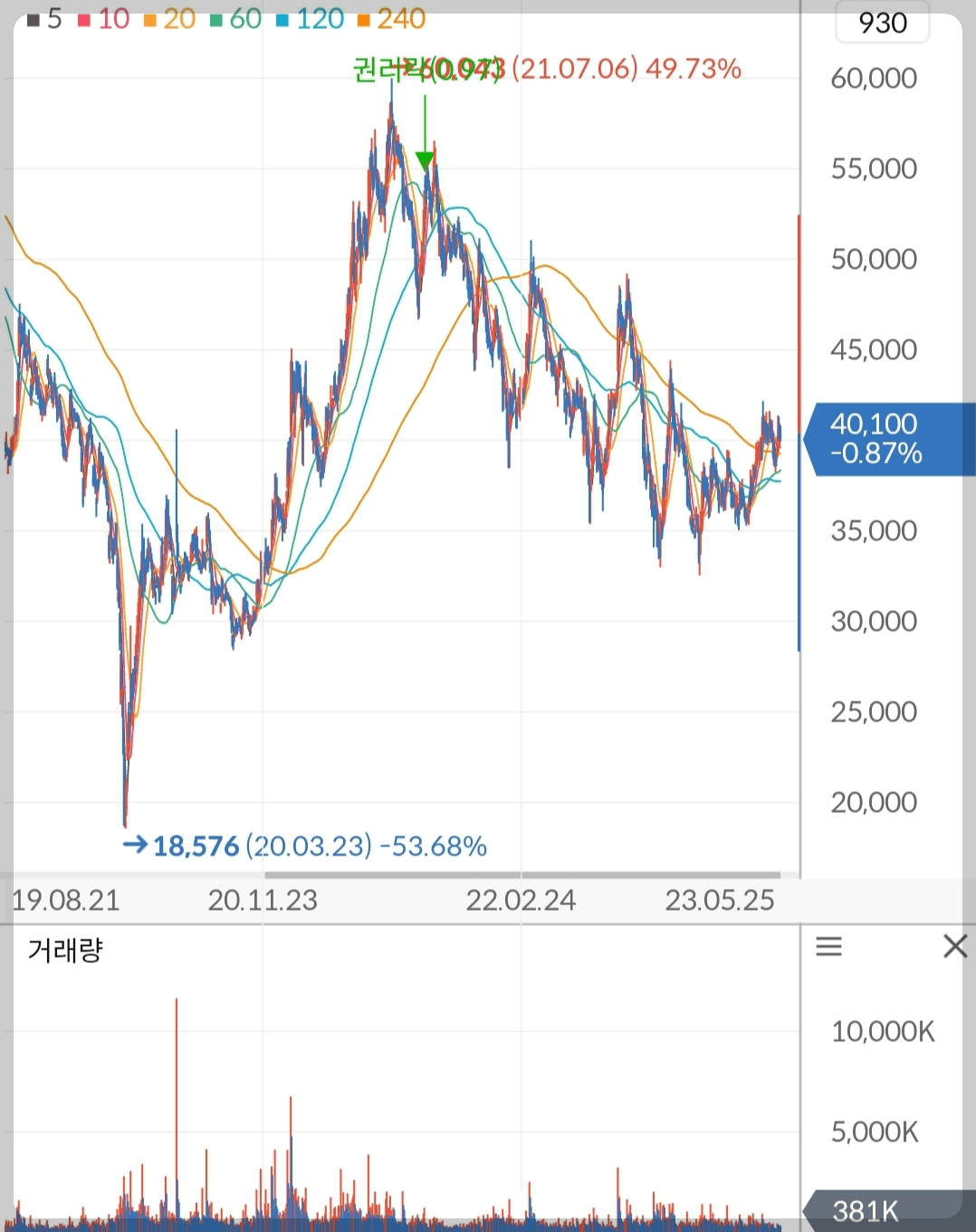 - '20년 3월 코로나 팬데믹 선언 ▼ 주가 18,500원까지 하락