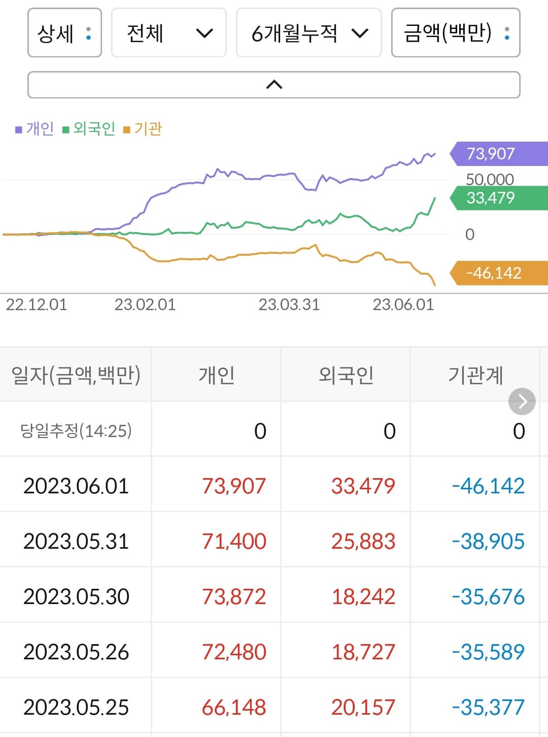 - 개인 739억 매수, 외국인 334억 매수, 기관 461억 매도