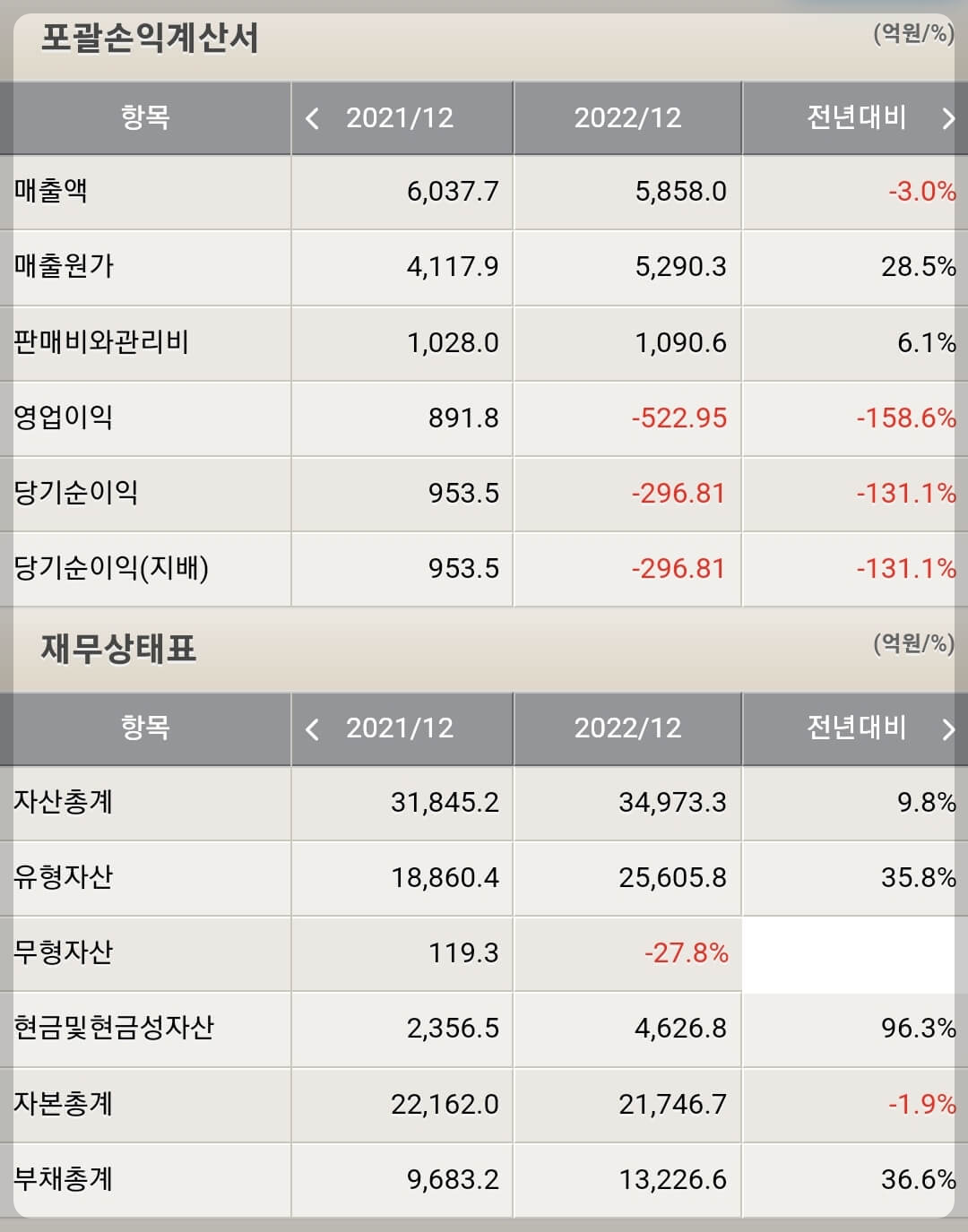그럼에도 불구하고 SK이노베이션이 SK아이이테크놀로지를 물적분할 후 상장한 이유는 현금마련과 지주사 전환을 통한 상속세 부담 완화 목적이었을 겁니다. 공모 당시 판타지 소설 같은 리포트를 쏟아내며 상식적으로 불가능한 시가총액 20조까지 도달하자 개인투자자들에게 물량을 넘겨 차익실현에 성공했고 거짓말같이 2022년 영업이익 -500억으로 적자전환하며 밑바닥을 드러냈습니다.