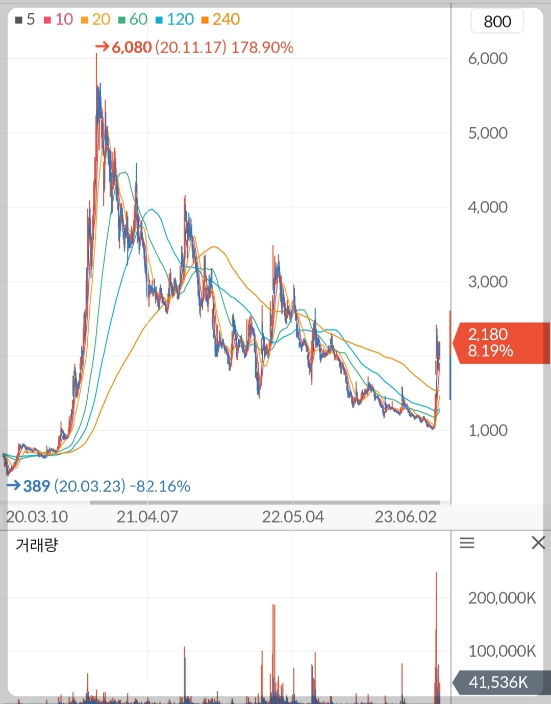 - 최근 핫한 테마에 편입되며 역대급 거래량 기록 중