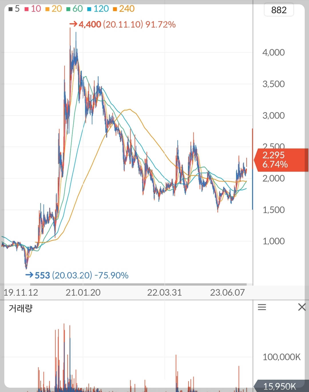 - '20년 3월 코로나 팬데믹 선언 ▼ 주가 550원까지 하락