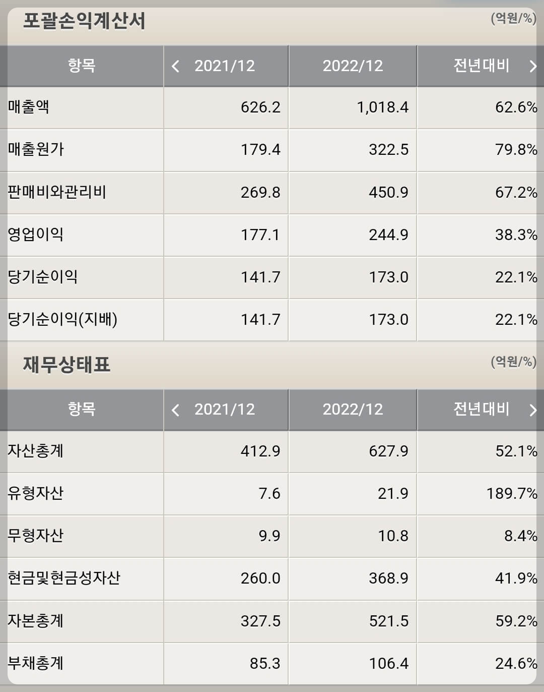 마녀공장의 재무제표를 보면 자본대비 부채비율이 20%에 불과해 재무 건전성이 매우 우수하고 상장으로 조달한 현금 300억 원으로 사업확장이 기대되는 바, 마녀공장의 재무 부문 종합등급은 B등급으로 평가하겠습니다.