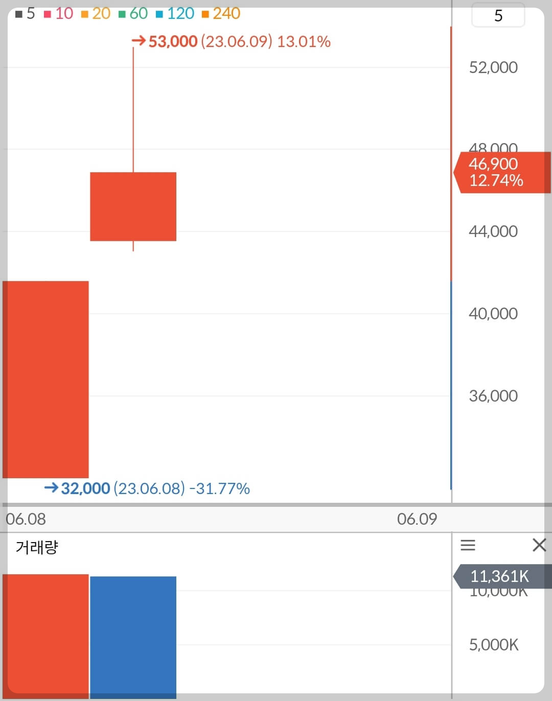 - 유통주식이 많이 적은 품절주임에도 단타 거래가 많이 유입되며 높은 거래량 유지