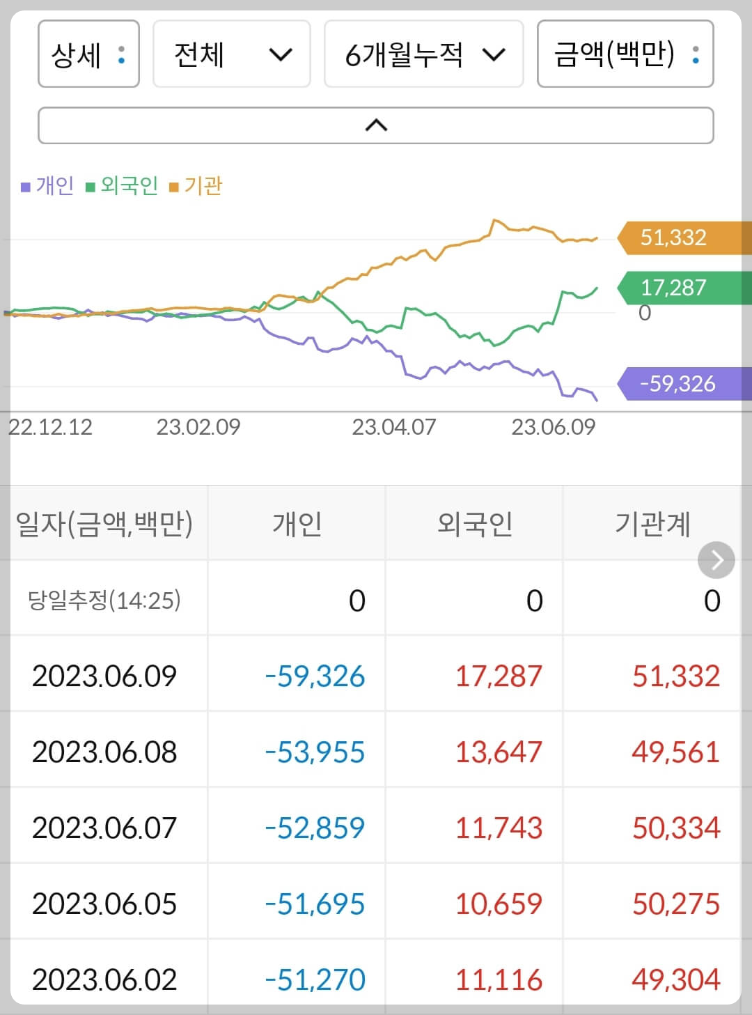 - 개인 593억 매도, 외국인 172억 매수, 기관 513억 매수