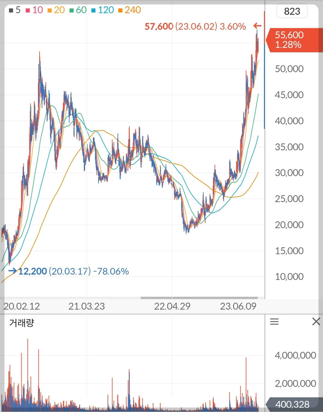 - Chat GPT로 AI 시대 개화에 따른 실적성장 기대감 반영 ▲ 주가 55,000원대 하락