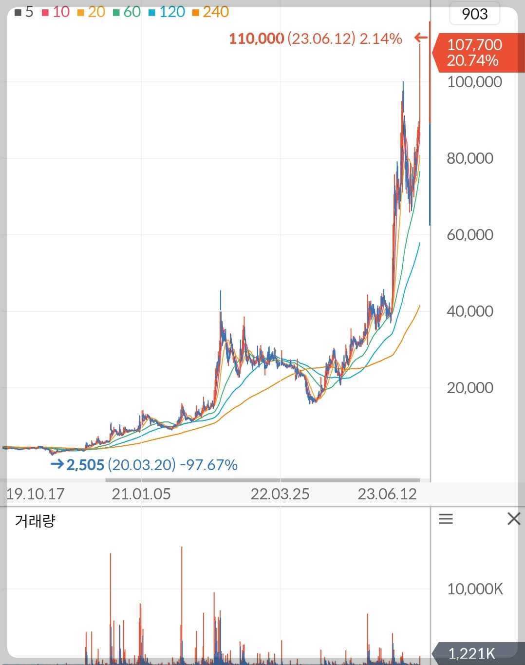 차트를 보면 20년부터 21년도까지 1,000만주를 훨씬 상회하는 또는 비슷한 초대형 거래량이 반복적으로 터지며 누군가가 충분히 매집했음을 알 수 있습니다. 자연적인 거래로는 나타나지 않는 거래량과 차트이기 때문에 해당 종목에는 주포와 쩐주가 반드시 존재합니다. 또한 역사적 신고가 종목은 매도하지 않은 모두에게 수익을 줘야 하기 때문에 작전을 위해서는 엄청난 규모의 자금이 수반됩니다. 최소 수천억 원에서 조 단위의 금액을 회전시킬 수있는 세력이 존재함을 추정할 수 있습니다.