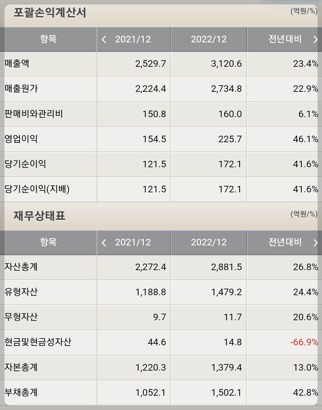 양극재는 2차전지의 주행거리를 결정하는 핵심 소재이므로 2차전지 가격의 약 40%를 차지하는데 알루미늄박은 약 1.8%를 차지하고 있습니다. 최근 3개년간 전기차 수요 성장에 따라 배터리업체들이 공격적으로 증설에 나서면서 양극박 매출이 증가한데다 지난 해 러·우전쟁 여파로 알루미늄가격이 급등하면서 수익성도 개선되고 있습니다.
