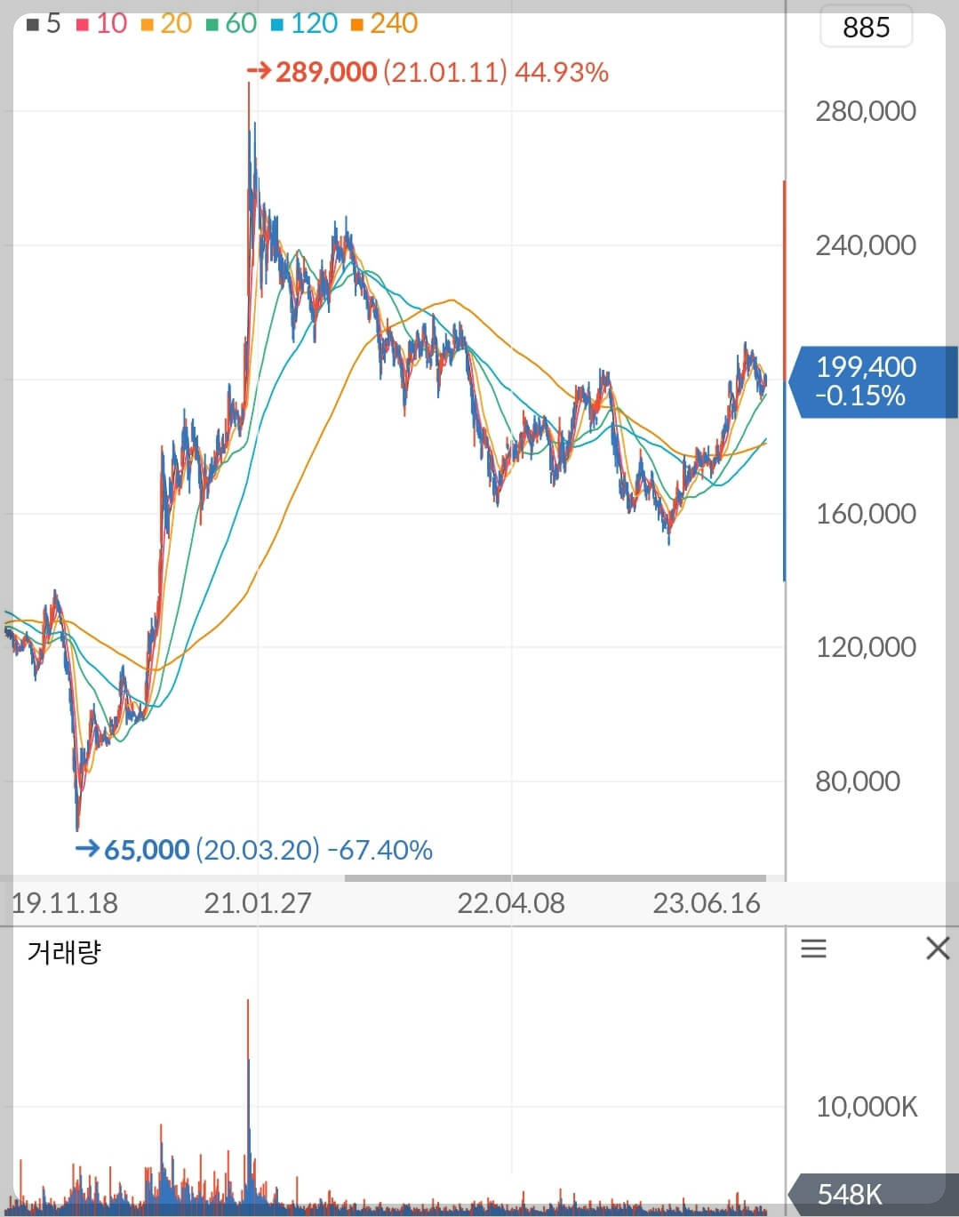 - '20년 3월 코로나 팬데믹 선언 ▼ 주가 65,000원까지 하락