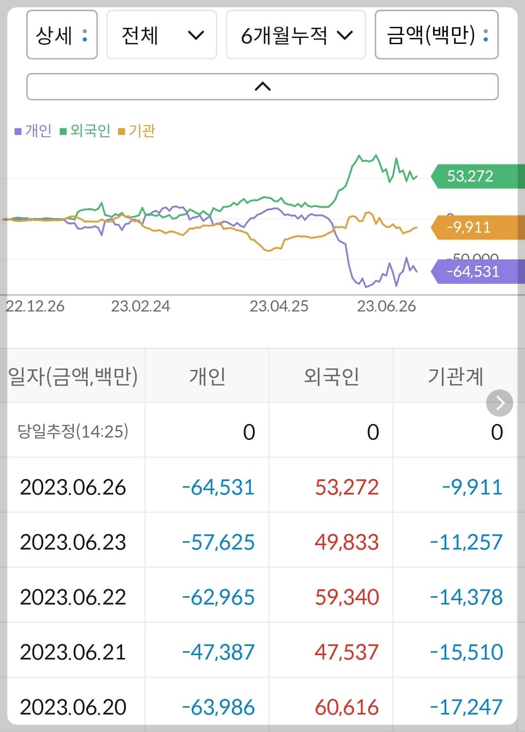 - 개인 645억 매도, 외국인 532억 매수, 기관 99억 매도