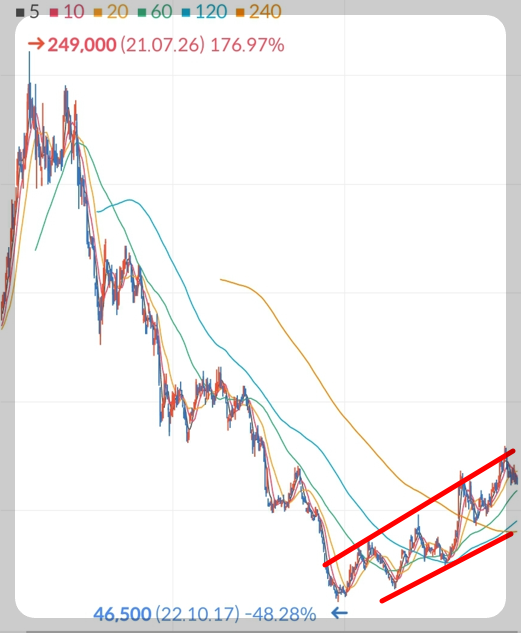 차트를 보고 결과론적으로 말씀드리는 것이 아니라 장기이평선의 추세전환이 확인되지 않는 상황에서 대세 하락기에 진입한 종목을 매수하는건 굉장히 위험하고 도박과도 같은 매매라는 것을 말씀드리는 겁니다. 고점과 저점이 모두 낮아지고 있는데 무엇을 기대하고 매수를 하는 걸까요?
