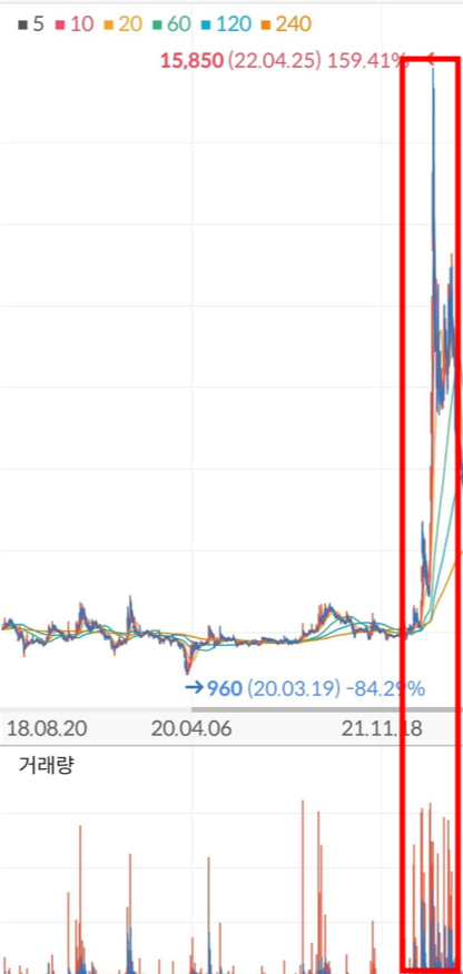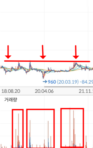 이제 작전을 위해 주식을 매집하기 시작합니다. 엄청난 거래량이 터지고 있음에도 불구하고 주가는 특정 지점을 넘지 못하게 철저하게 관리되고 있습니다. 코로나 팬데믹 당시에 960원까지 하락했지만 다시 관리하던 주가 범위로 돌아와 매집을 이어가고 있는 모습을 보실 수 있습니다. 이런 주가 흐름과 거래량은 절대로 자연적으로 발생할 수 없고 누군가 특정 가격대에서 확신을 가지고 물량을 모아가는 행위라고 볼 수 있습니다.
