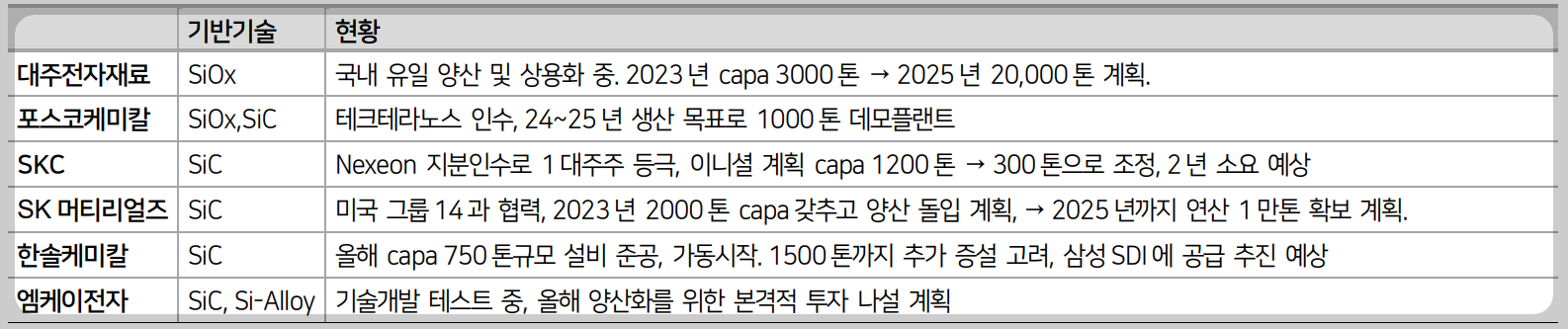 이미 실리콘음극재 양산에 돌입한 대주전자재료는 중국 BTR, Shin-Etsu Chemica에 뒤를 이어 글로벌 3위에 랭크되어 있고, 국내에서는 캐파나 수율 부문에서 경쟁사 대비 가장 앞서있는 건 사실이나 후발주자들도 2023년 하반기부터 양산을 목표로 하고 있다는 점은 리스크로 작용할 수 있습니다. 아직 실리콘 음극재 수요가 높지 않은 상황에서 경쟁사들이 늘어나는 것은 분명히 좋은 소식은 아니죠.