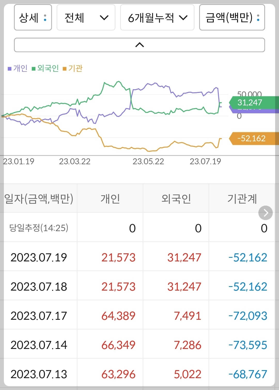 - 개인 215억 매수, 외국인 312억 매수, 기관 521억 매도