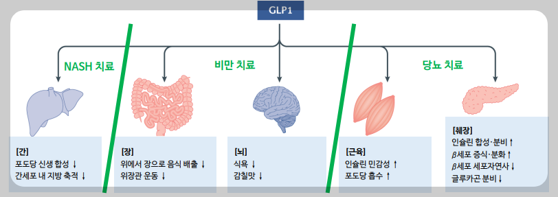 하지만 GLP-1이 등장하고 비만 치료제 시장은 180도 완전히 바뀌었습니다. GLP-1은 인체 내 소장의 L세포에서 식후에 분비되는 호르몬인데, 식욕을 낮추고 포만감을 지연(위장관 운동 저하)시키는 등 음식 섭취를 줄이는 기전으로 비만 치료효과를 나타냅니다. 비만, 다이어트 실패의 가장 큰 원인이 식탐이기 때문에 GLP-1 치료제는 엄청난 체중감소 효과를 입증했고 부작용도 구토, 어지럼증 등 경증이 대부분이었기에 엄청난 속도로 매출이 증가하기 시작했습니다.