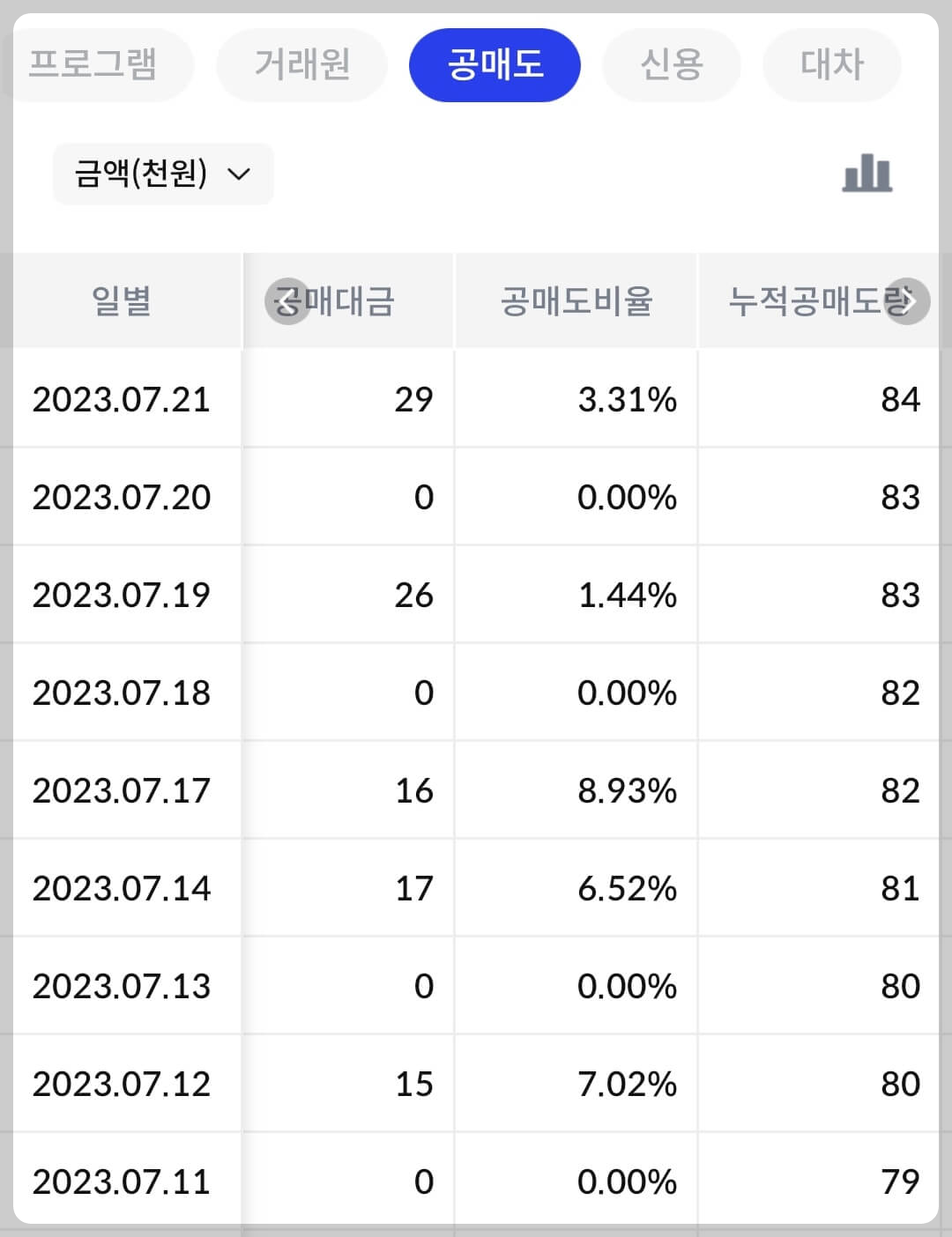- 개인 88억 매도, 외국인 7.4억 매수, 기관 85억 매수