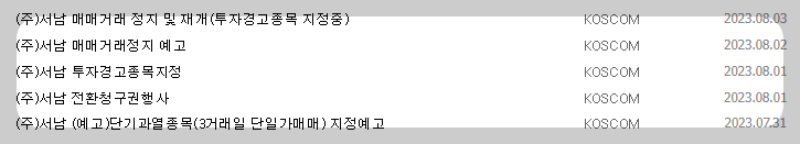 서남은 작전주이자 소형주이기 때문에 메이저 수급이나 공매도 수급은 없습니다. 작전세력과 개인 투자자들 간의 물량 교환이 주요 수급인 상황입니다. 따라서 서남의 수급 부문 종합등급은 C등급으로 평가할 것이 없습니다.