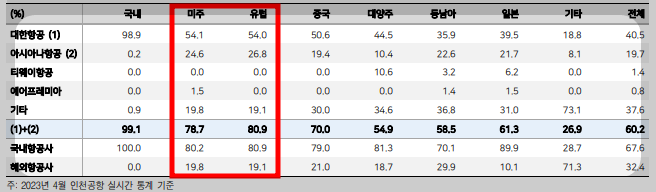 항공화물 부진 외에 추가적으로 우려되는 사항은 현재 기준 4분기 국제선 예약률이 현저하게 낮다는 겁니다. 대한항공에서는 이런 현상을 코로나 이후 예약 트렌드가 바뀌면서 일어나는 현상이라고 밝혔으나 4분기 진입까지 3개월도 안 남은 시점에서 예약률이 낮다는 건 기분 좋은 소식은 아닙니다.