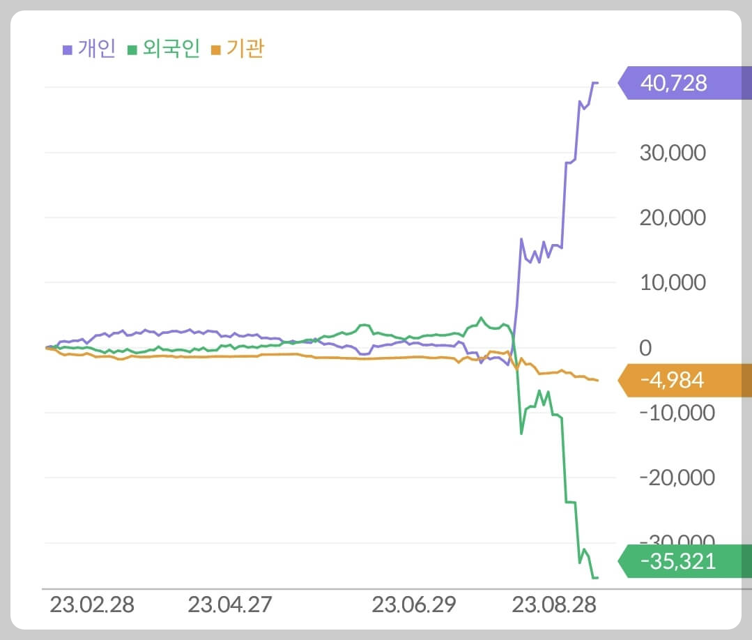 - 개인 400억 매수, 외국인 350억 매도, 기관 49억 매도