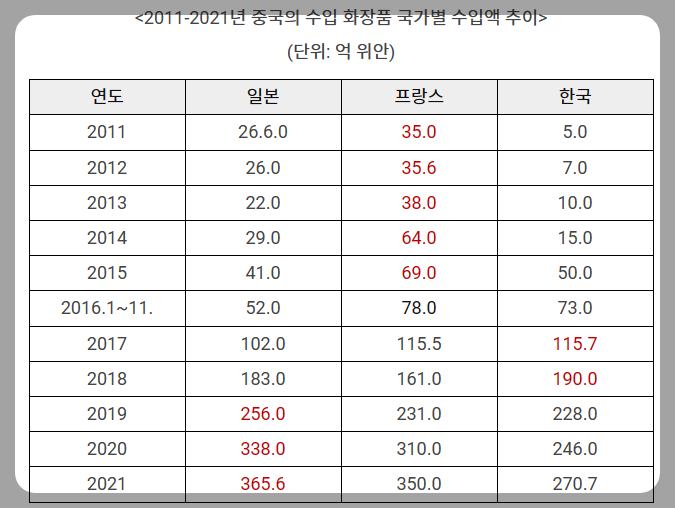 하지만 아모레퍼시픽은 중국 화장품 시장의 성장이 오히려 독이 되었습니다. 생활수준이 높아진 중국인들은 명품 브랜드를 소비하기 시작했고 화장품 시장에서도 가격이 높아 부담스러웠던 일본, 프랑스 명품 화장품들을 선호하기 시작했습니다. 위 자료를 보시면 2018년 이후 일본과 프랑스 화장품 수입 규모가 급격하게 증가했고 한국 화장품들은 성장세가 꺾였고 시장에서 버티기 위해 과도한 비용이 지출되며 영업이익률은 급감하기 시작했습니다.
