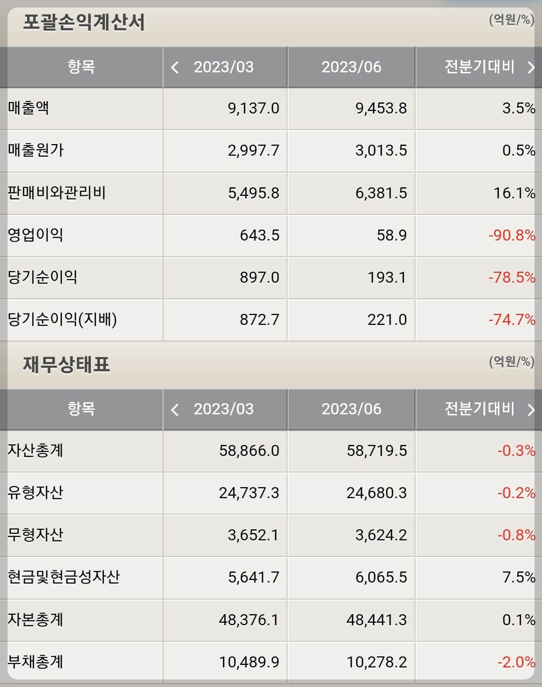 아모레퍼시픽은 23년도 2분기에도 영업이익 59억원을 기록하며 실적회복에 대한 불확실성을 키우고 있습니다. 실적을 자세히 보면 중국 법인 적자가 무려 -391억 원을 기록했고 국내 사업에서도 온라인 -25%, 면세 -18%, 방판 -7.3%, 백화점 -2.4%로 전 채널 부진하며 어닝쇼크를 기록했습니다. 특히, 중국내에서 매출액을 유지하기 위해 과도한 마케팅 비용을 지출했는데 그 규모가 매출 대비 40%에 달해 수익모델이 크게 훼손되었습니다. 물론, 중국 외 북미 지역에서 설화수와 라네즈가 나름 고성장을 지속하고 있지만 여전히 매출비중이 너무 작아 증익 기여도가 크지 않습니다.
