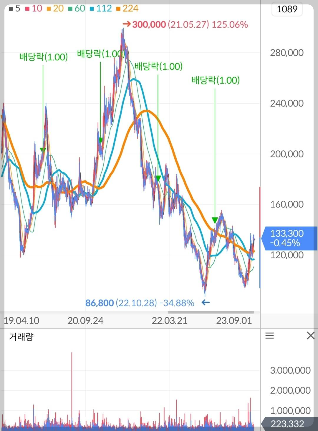 - 코로나 종식에 따른 리오프닝 기대감으로 ▲ 주가 300,000원대 상승