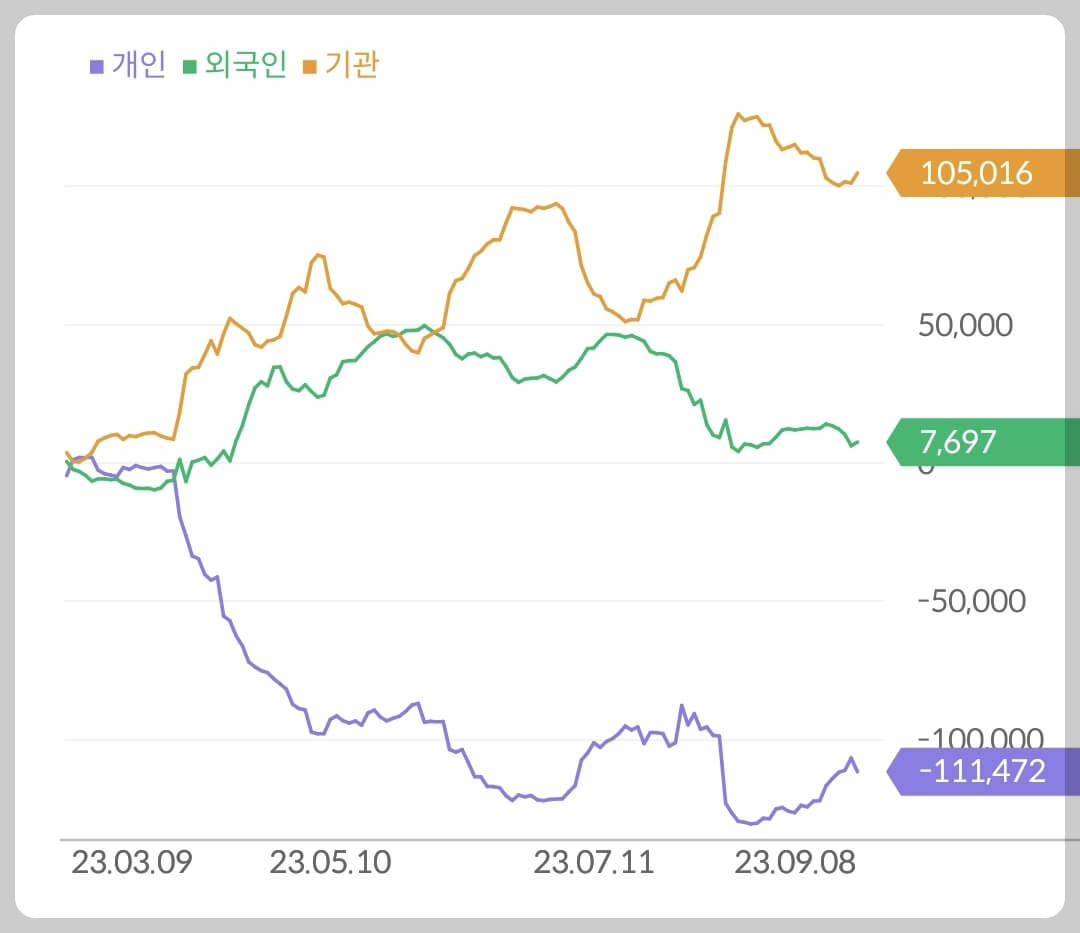 - 개인 1,114억 매도, 외국인 7,697억 매수, 기관 1,050억 매수
