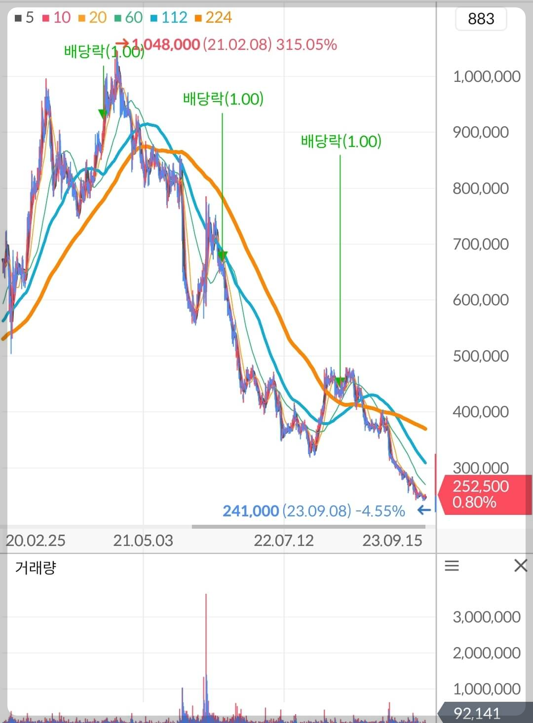 - '20년 3월 코로나 팬데믹 선언 ▼ 주가 500,000원까지 하락