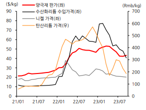 기본적으로 원자재 가격은 판가와 연관성이 매우 높습니다. 원자재 가격이 하락한다면 일반적으로 양극재 가격은 하락 압력을 받을 수 밖에 없습니다. 이는 양극재 기업의 수익성을 훼손시키는 현상입니다. 아래 그래프를 보시면 실제 주요 원자재 가격이 하락하자 양극재 판가가 하락하기 시작하는 것을 확인하실 수 있습니다. 그래도 여전히 높은 가격을 유지해 주는 이유는 시장 수요레벨이 굉장히 높기 때문으로 해석할 수 있습니다. 시장수요는 견고하지만 원자재 가격 하락으로 판가가 하락압박을 받고 있다는 결론을 내릴 수 있습니다. 양극재는 타 핵심소재 대비 공급량이 가장 타이트한 소재임은 분명하죠.