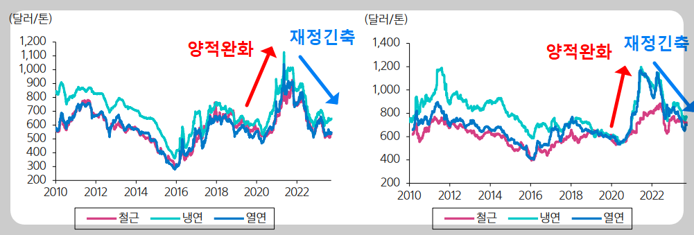 현대제철에 투자하시는 주주라면 기본적으로 철강섹터에 대한 이해가 되어 있으셔야 합니다. 철강섹터는 경기 민감주로 양적완화로 유동성이 풍부한 시기에 수혜를 볼 수 있는 섹터입니다. 시장에 돈이 많이 풀리니 대규모 투자가 활발해지고 철강 수요가 높아지며 철강제품의 ASP도 반등하는 것이죠. 그렇다면 지금의 거시경제는 어떤 상황일까요?